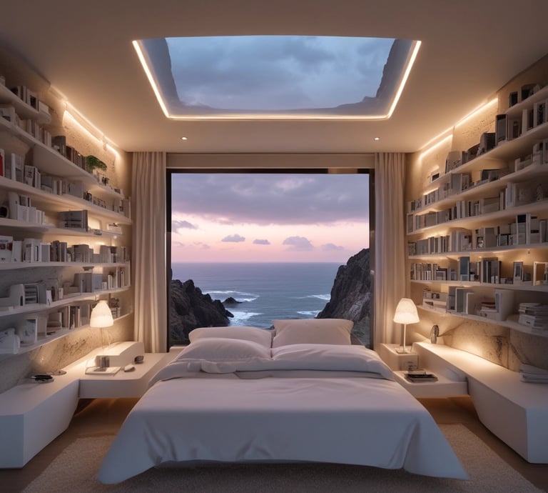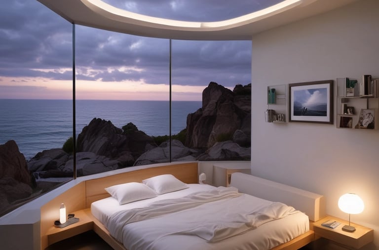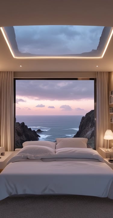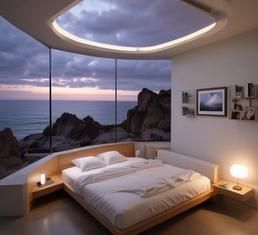 Key Experience: The moody, cinematic ambiance of the room draws your focus to the bright light illuminating the Ocean outside. This is a space for meditation, reflection, and enjoying the luxury of texture. You are not just staying; you are starring in your own private film noir.